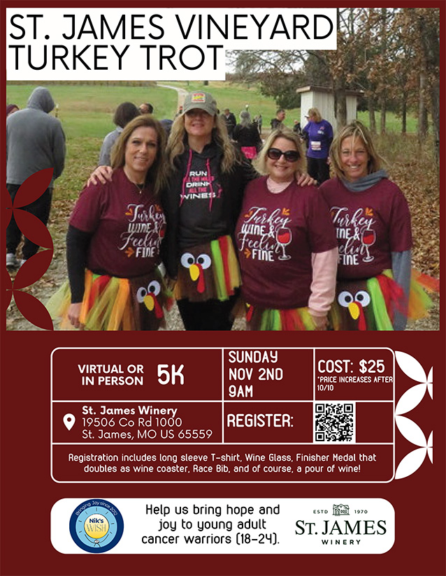 What: St. James Vineyard Turkey Trot 5K - A fun and festive Thanksgiving-themed 5K run/walk at the award-winning St. James Winery. Participants will race through the beautiful vineyard, receive exclusive race swag (super soft long sleeve t-shirt, shatterproof wine glass, finisher medal), and enjoy a post-race wine pour. All proceeds from the event benefit the Nikolas Ritschel Foundation (Nik's Wish), helping grant wishes to young adults battling cancer.